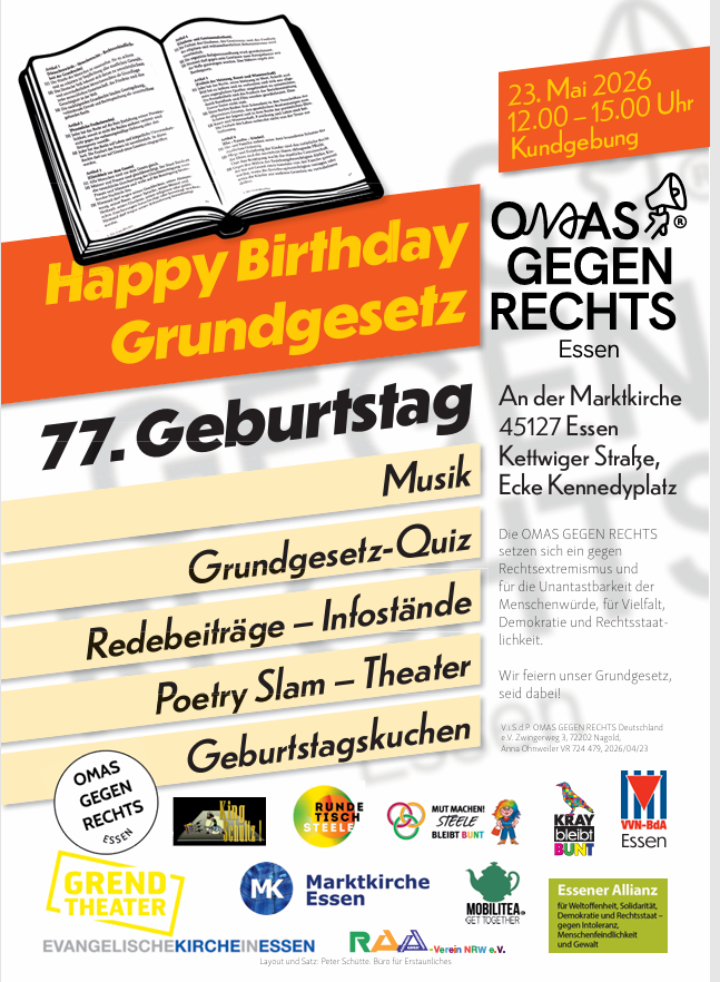 Wir OMAS GEGEN RECHTS in Essen möchten die Artikel des Grundgesetzes für Bürgerinnen und Bürger erlebbar machen und gemeinsam den Geburtstag unserer Verfassung feiern.