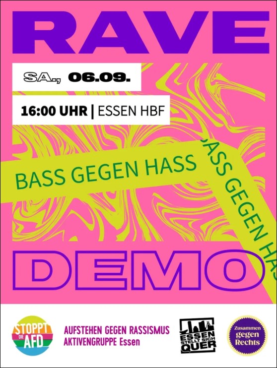 Am 6. September 2025 wird es wieder laut gegen Rechtsextremismus und Intoleranz: Die Rave-Demo BASS GEGEN HASS zieht kurz vor der Kommunalwahl durch Essen.  Der Rave steht in diesem Jahr unter dem Motto  „Bass gegen Hass – Solidarisch in die Kommunalwahl“  und wird von drei Initiativen gemeinsam organisiert: „Aufstehen gegen Rassismus“, „Essen stellt sich quer„ und „Zusammen gegen Rechts Essen“.